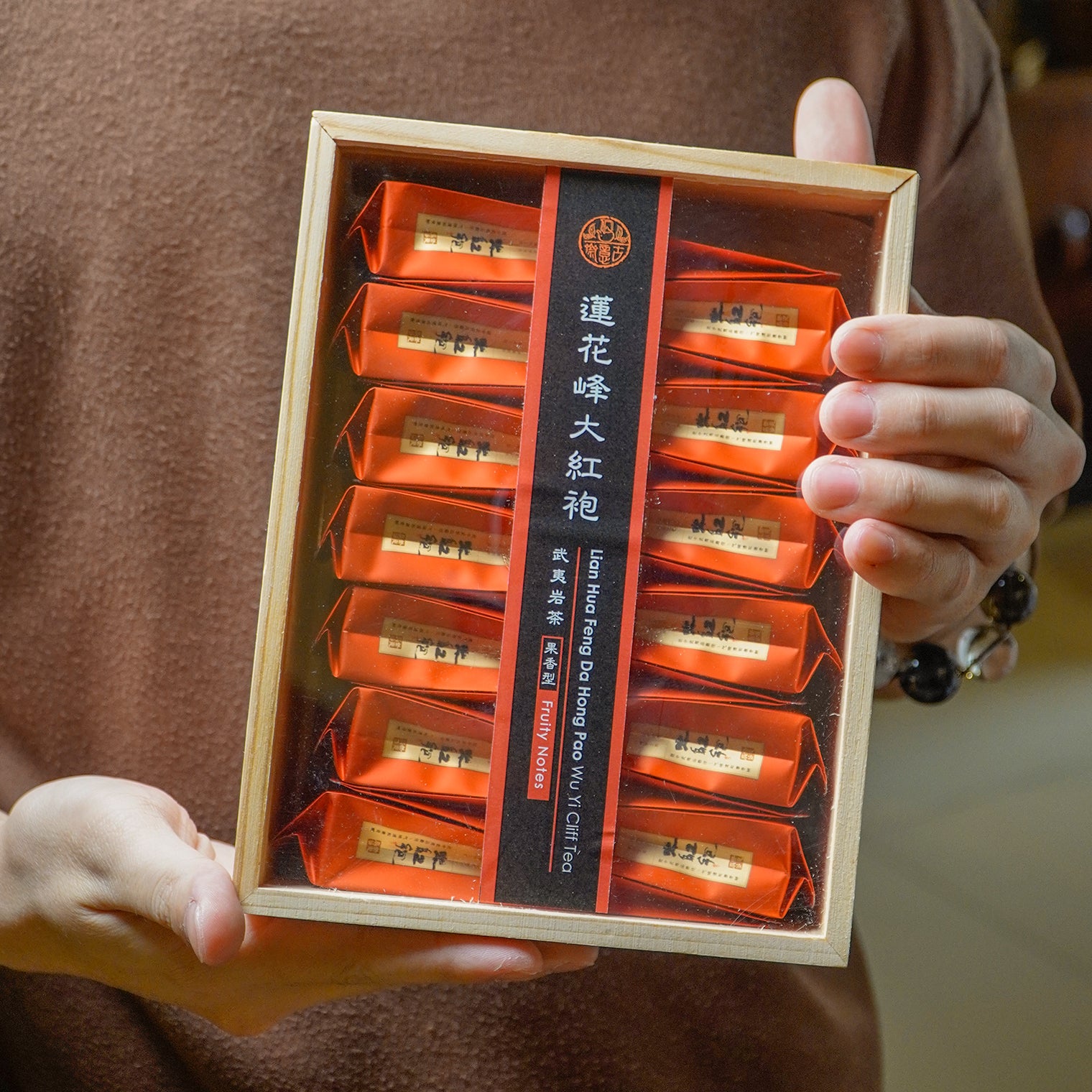 Diperolehi daripada semak teh Rougui premium di Pergunungan Wuyi, teh ini menawarkan "yan yun" (sajak rock) yang kaya dan aroma berlapis yang unik. Dihasilkan secara pakar menggunakan kaedah pemanggangan arang tradisional, minuman keras teh berwarna merah ambar terang. Ia meluncur dengan lancar pada lelangit dengan aroma buah-buahan semula jadi yang elegan, nota kayu manis yang halus, dan rasa manis yang lembut dan berkekalan. Haruman tersergam indah di bahagian bawah cawan.